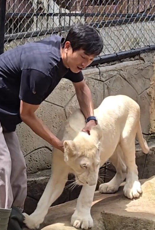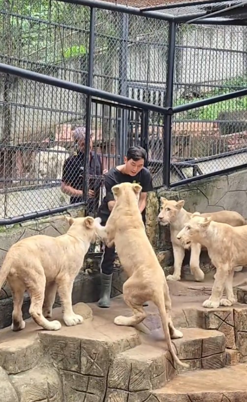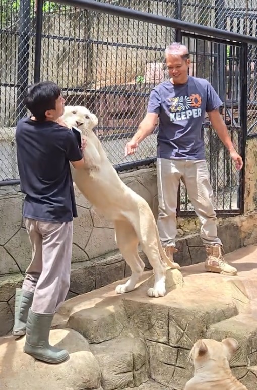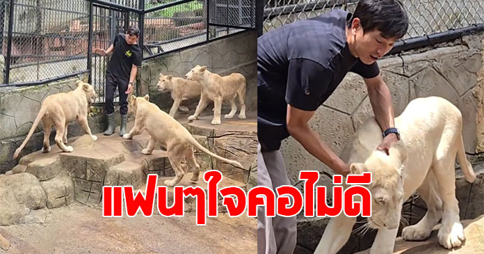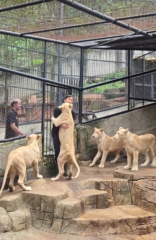 สิงโตตัวใหญ่ต่างก็กระโดดเข้ามาใส่ด้วยความดีใจ เมื่อได้เห็นหนุ่มภูผา เข้ามาเล่นในกรงด้วยคอยมานั่งข้างๆ คอลเคลียด้วยความอ่อนโยน